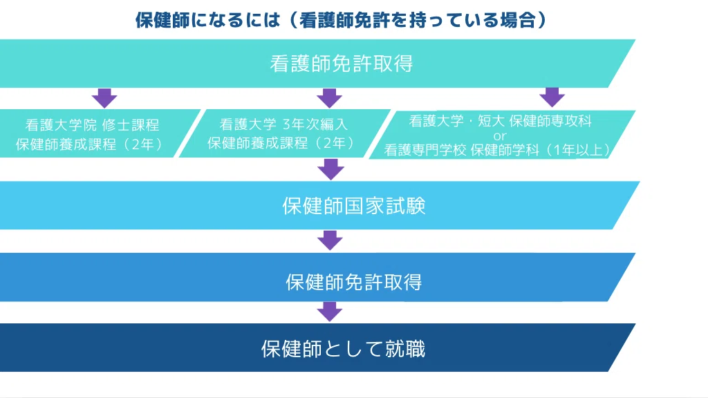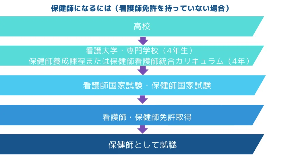 看護師免許を持っていない場合は、保健師養成課程のある大学や4年制の専門学校に進学し、看護師の国家試験を受験すると同時に保健師の国家試験を同年受験するのが最短のルートとなります。
